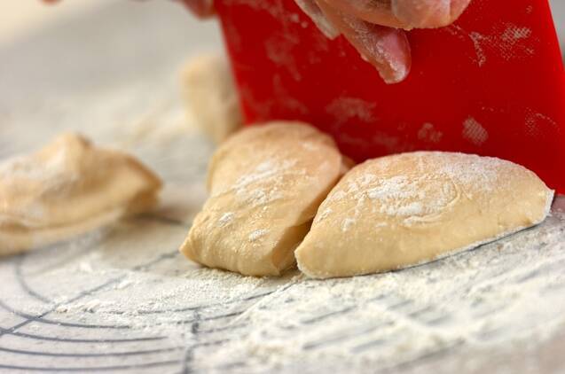 指に分量外の強力粉をつけてフィンガーテストをし、まんべんなくガスを抜いて、生地を6等分する。丸めなおしてベンチタイムを10分。