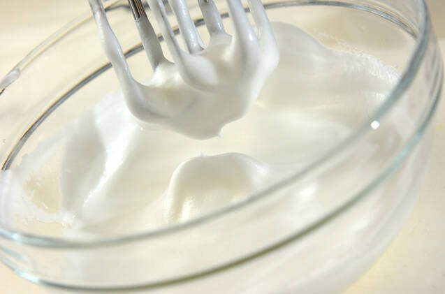 <メレンゲ>を作る。ボウルに卵白を入れてよくほぐし、グラニュー糖を2~3回に分けて加え、角が立つまでハンドミキサーで泡立てる。