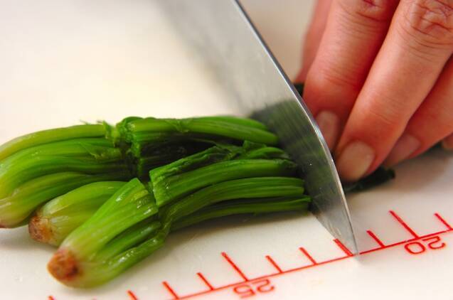 ホウレン草は熱湯でゆでて水に取り、粗熱が取れたら水気を絞り、長さ4cmに切る。<ゴマ風味ポン酢>の材料を混ぜ合わせる。