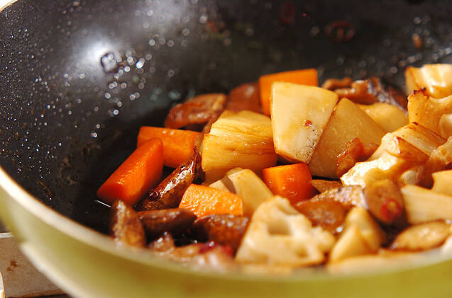 <調味料>を加え、汁気がほとんどなくなるまで炒め合わせ、器に盛る。白ゴマを指先ですりつぶしながら、香りを立たせて振り掛ける。