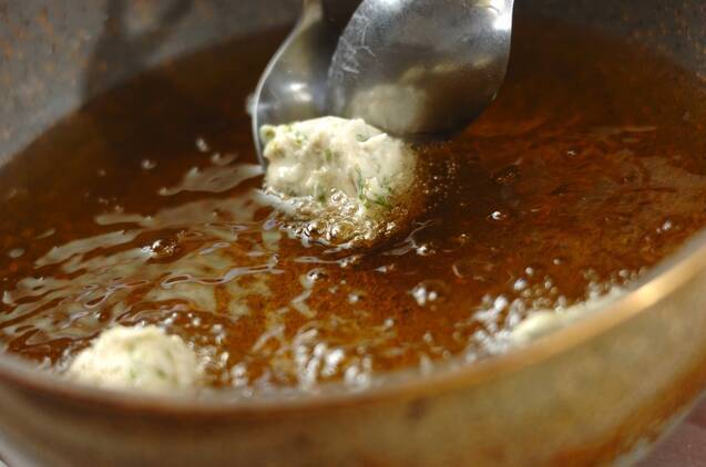 揚げ油を160℃に予熱し、耐熱のスプーンをくぐらせて(2)をひとくち大にすくって入れる。