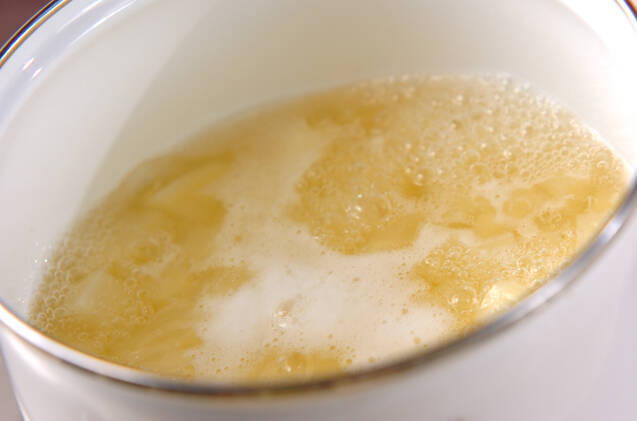 鍋に水気を切ったジャガイモ、だし汁を加えて強火にかけ、煮立ったら火を弱めて煮る。