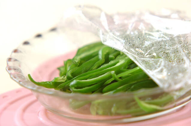 ピーマンはサッと水に通し、ぬれたまま耐熱容器に入れてラップをし、電子レンジで2分加熱して、水気をきる。(ヒント)電子レンジは600Wを使用しています。
