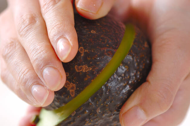 アボカドは縦に一周切り込みを入れ、両手でねじって2つに分ける。包丁の角で種を刺してねじり取り、スプーンで中身を取り出して、ザク切りにする。