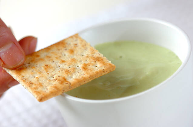 器に注ぎ、クラッカーを添えてカレー粉を振り掛ける。