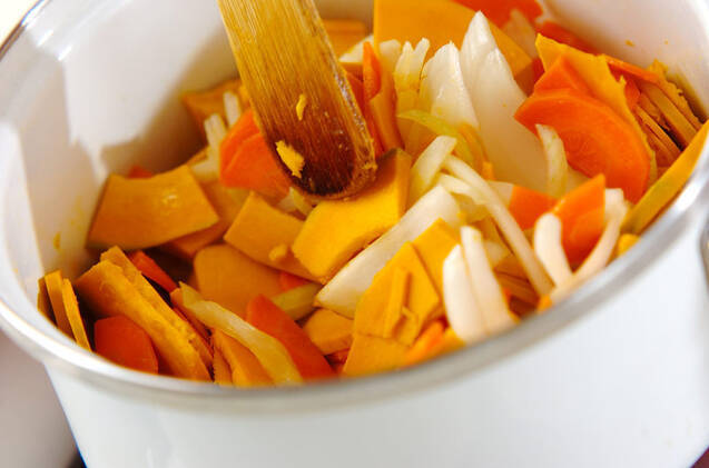 鍋にバターを入れて中火にかけ、溶けたらニンジン、カボチャ、玉ネギをしんなりするまで炒める。
