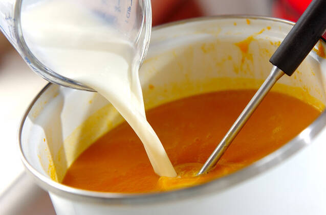 牛乳を加えて煮たつ直前に火を止め、塩コショウで味を調える。器に注ぎ、生クリームを加えクルトンを散らす。