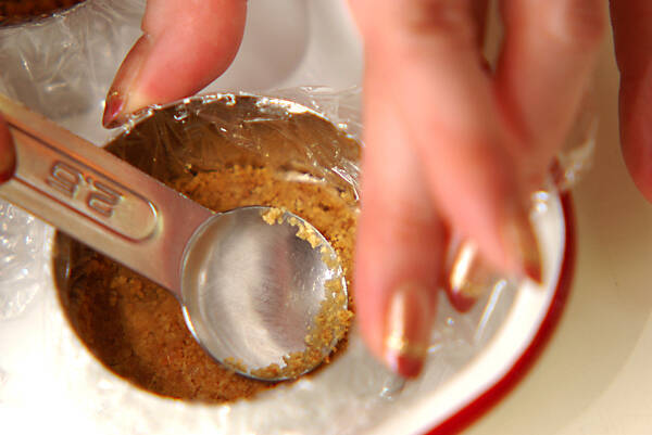 平らなバット等にセルクルを間隔を開けて並べ、内側全体にラップをする。1の生地を等分に分けて、底に平らに敷き詰め底が平らなもので堅く押さえつける。