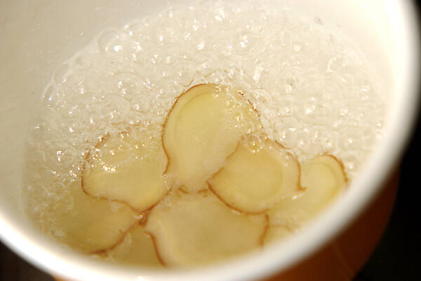<ヨーグルト生地>を作る。粉ゼラチンを水に振り入れ、ふやかしておく。<ジンジャーシロップ>のショウガは皮ごときれいに水洗いし、水気をきって薄切りにする。小鍋に砂糖、薄切りショウガ、水を入れ中火にかけ、煮立てば火を少し弱め、砂糖が煮溶けるまで煮る。