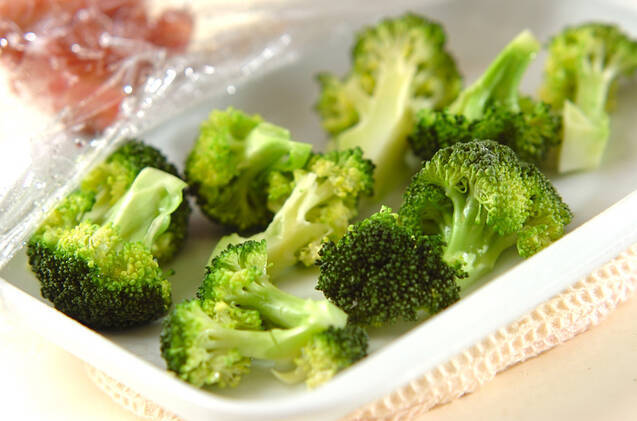 ブロッコリーは小房に分け、サッと水に通して耐熱容器に入れ、ラップをして電子レンジで1分加熱する。電子レンジは600Wを使用しています。