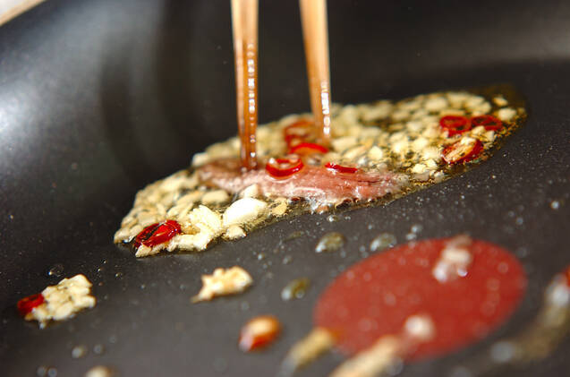フライパンにニンニクとオリーブ油を入れて弱火にかけ、香りがたってきたらアンチョビと赤唐辛子を加え、炒める。