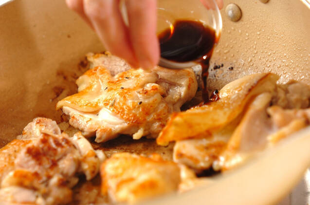 焼き色がついたら鶏もも肉をひっくり返し、同様に焼き色をつける。さらにしょうゆを加え、全体にからめる。
