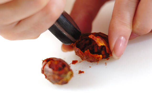くちなしの実は半分に割り、ガーゼで包むかだし袋に入れる。