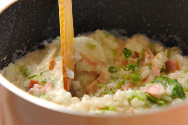 牛乳と粉チーズ、七草がゆセットを加え、混ぜながら煮る。塩で味を調えたら器に盛り、粗びき黒コショウを振る。仕上げにオリーブ油小さじ1をかける。