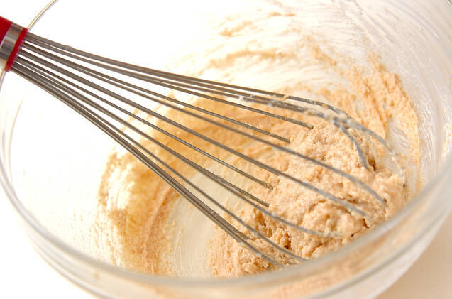 常温に戻した柔らかいバターをボウルに入れ、砂糖類、塩を加え泡立て器ですり混ぜる。