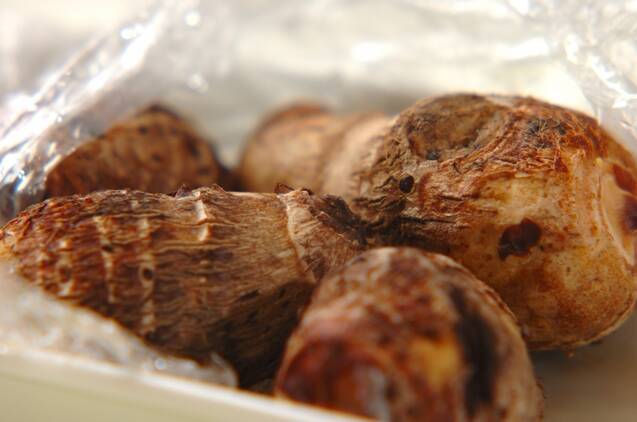 里芋は皮付きのまま水洗いし、ぬれたままラップで包み、電子レンジで3分加熱し、上下を返してさらに1~2分加熱して取り出す。