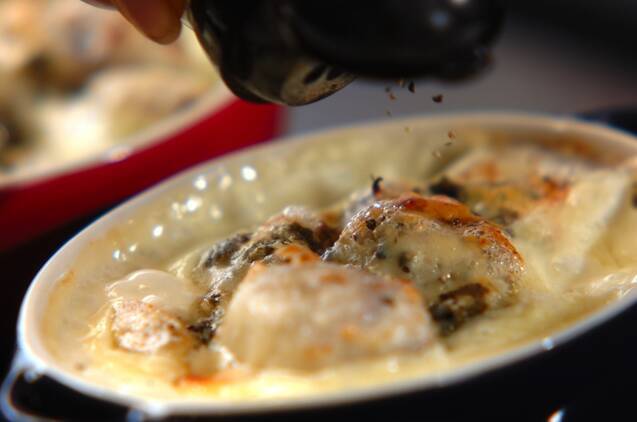 230℃に予熱しておいたオーブンで約10分焼き、粗びき黒コショウを振る。