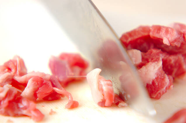 ラム肉はサイコロ状に切り、玉ネギはみじん切りにする。