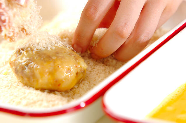 (1)のジャガイモに(2)、かつお節を混ぜ合わせる。まとまりにくい場合はだし汁を加え、少し柔らかくして下さい。 8等分の小判型にまとめ、小麦粉、溶き卵、パン粉と<衣>をつける。