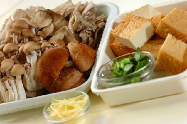 厚揚げは4等分に切る。シイタケは石づきを切り落とし、半分に切る。シメジとマイタケは手で食べやすい大きさにほぐす。ミツバは長さ1cmに、ショウガは細切りにする。<水溶き片栗>の材料は混ぜ合わせておく。