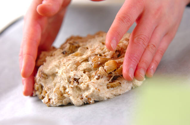 全体が混ざったところでオーブンシートを敷いた天板にのせて、ざっと手で丸く形を整える。