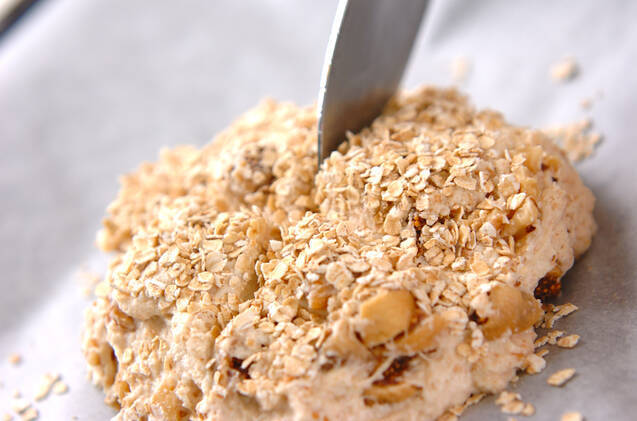 生地の表面にオートミールを振り掛け、包丁で十文字の切り込みを入れる。190℃で温めたオーブンで35~40分焼く。※焼いている間に表面が焦げそうになったら、生地にアルミホイルをかぶせて下さい。※ここではガスオーブンを使用しています。オーブンにより、温度差や焼き時間には違いがあるので、ふだんからお家のオーブンの癖を知っておくことをおすすめします。目安として小型の電気オーブンの場合、レシピより10~20℃高い設定にして下さい。