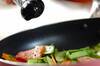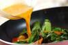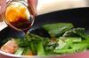 小松菜の葉の部分を入れて炒め、すぐにしんなりするので、オイスターソースを入れて混ぜる。