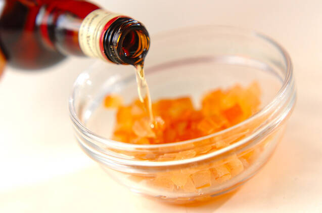 粗みじん切りにしたオレンジピールにグランマニエを加えてほぐしておく。