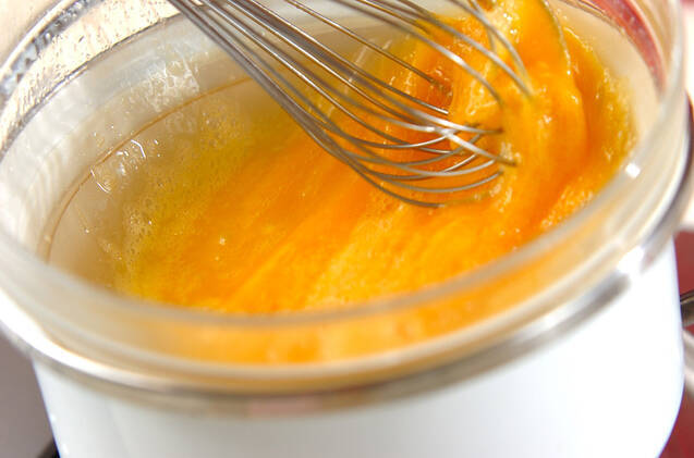 ボウルに卵を入れて溶きほぐし、グラニュー糖を加えて湯煎にかけながら、人肌程度になるまで泡立て器でしっかり混ぜ合わせる。