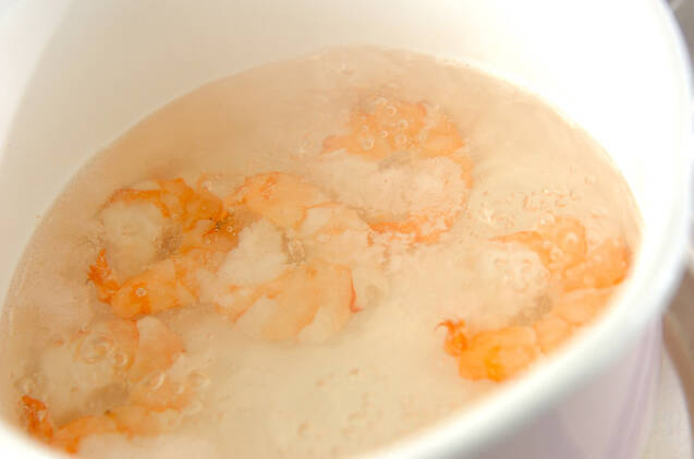 熱湯でエビをゆで、3等分に切る。
