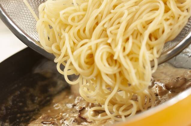 (2)のソースがスパゲティーとからみやすくなる位まで煮詰まったら、(3)のスパゲティー、パルミジャーノチーズ、イタリアンパセリを加え、よく混ぜ合わせて器に盛る。