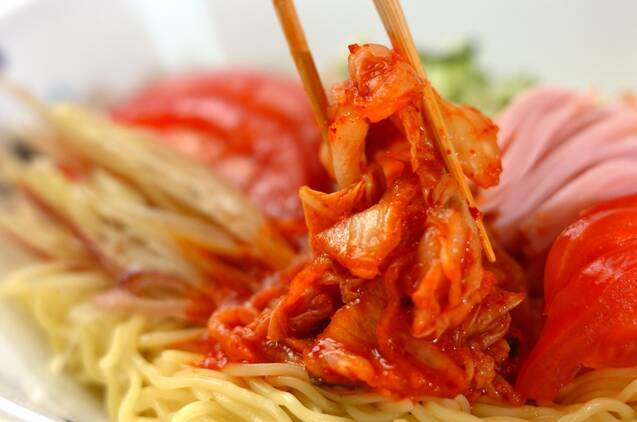 白菜キムチ、ハム、トマト、キュウリ、ミョウガを盛り合わせ、食べる直前に<タレ>をかける。