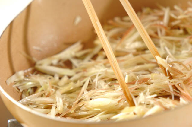 フライパンにゴマ油を中火で熱し、らっきょうとミョウガを炒める。全体に火が通ったら、<合わせ調味料>を加えて強火にし、水気をとばす。