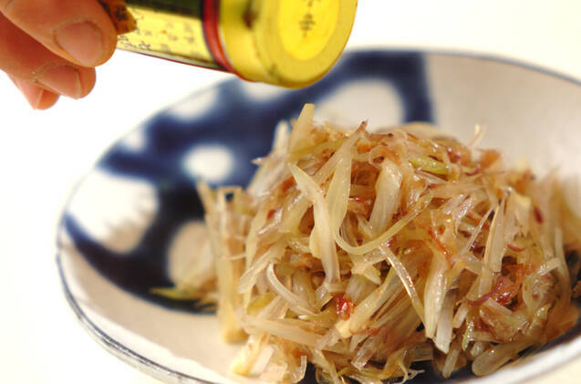 かつお節を加えて混ぜ合わせ、器に盛って七味唐辛子を振る。