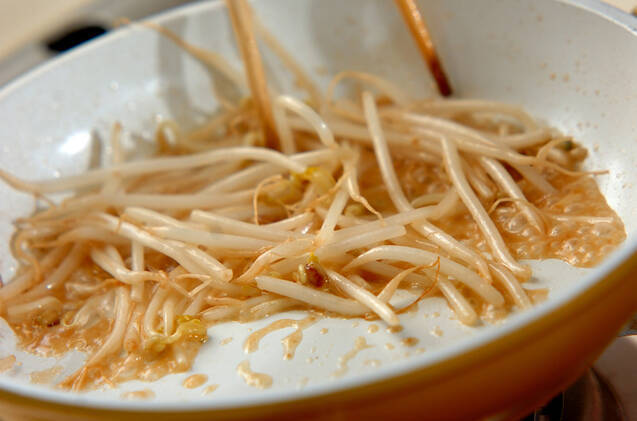 フライパンにゴマ油を熱し、モヤシを炒める。ゴマダレを加えて汁気がなくなるまで炒め合わせる。