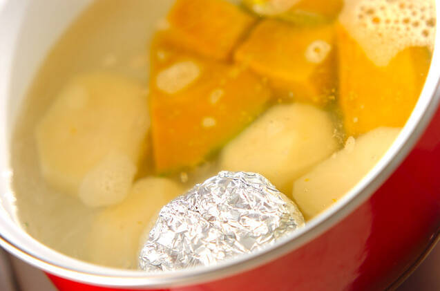 鍋にジャガイモ、カボチャ、アルミホイルで包んだ卵を入れ、強火にかけて煮立ったら火を弱めて6~7分ゆで、ザルに上げる。竹串でジャガイモを刺してスッと刺さったらOKです。