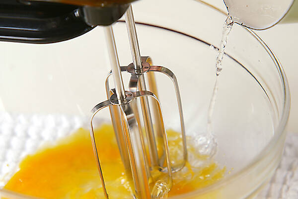水とグラニュー糖を沸騰させ、それを卵黄を入れたボウルへ糸状にゆっくり入れ、卵黄が固まってしまわないようにすばやく混ぜ続ける。2の板ゼラチンは水気を切って水大1(分量外)を加え電子レンジに20秒かけて溶かし、卵黄のボウルに入れ良く混ぜる。さらに1のマスカルポーネも入れて良く混ぜる。
