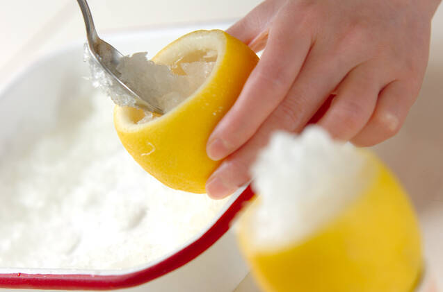 レモンの器に山高くすくい入れ、ミントの葉を飾って出来上がり。