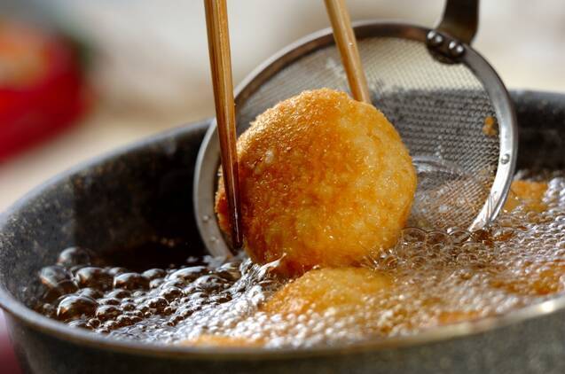 (2)に<衣>の小麦粉、溶き卵、パン粉を順につけ、160℃に熱した揚げ油でおいしそうな揚げ色になるまで揚げる。