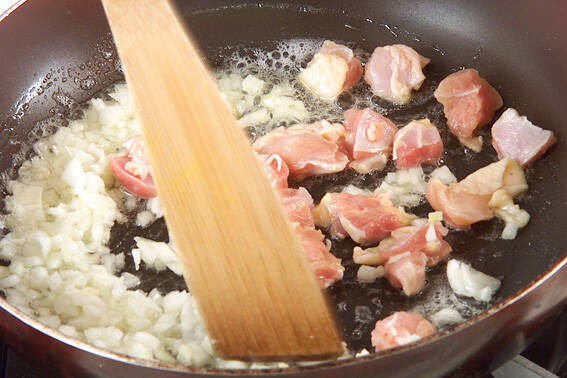 フライパンに強火でバター、サラダ油大1/2を熱し、みじん切りの玉ネギ、小さく切った鶏肉を炒め、玉ネギがしんなりすれば冷凍コーンを加えて炒めあわせ、塩、コショウで味を調える。