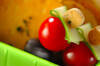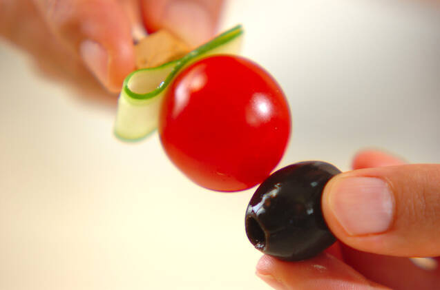 プチトマトはヘタを取る。キュウリは半分に軽く折り、ブラックオリーブ、プチトマトと共にピックに刺す。