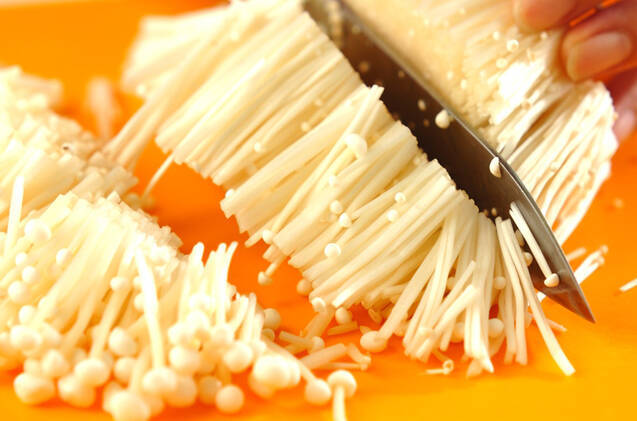 エノキは根元を切り落として長さを3等分に切り、根元は食べやすい大きさに分ける。