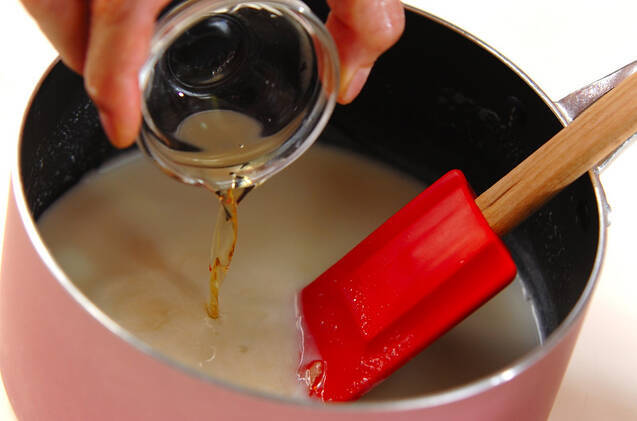 アマレットを加え、粗熱が取れたら器に流し入れ、冷蔵庫で冷やしかためる。(ヒント)調理時間に冷やしかためる時間は含まれていません。