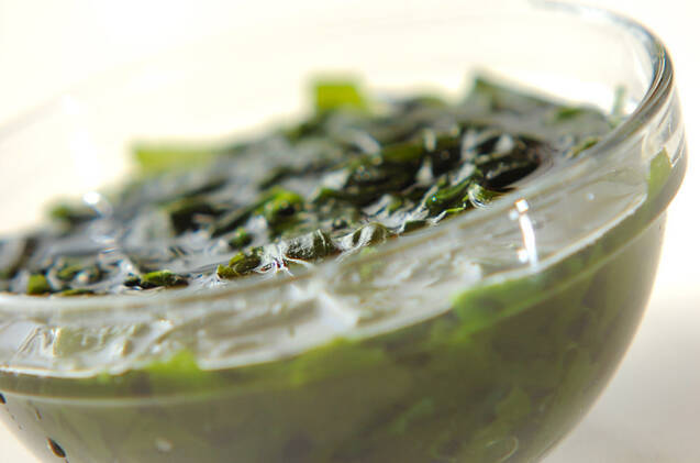 ワカメは水で柔らかくもどし、水気を絞り、長い場合はザク切りにする。