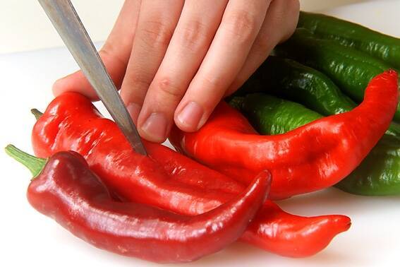 万願寺唐辛子は水洗いし焼いた時に皮が弾けないように、包丁で突いておく。