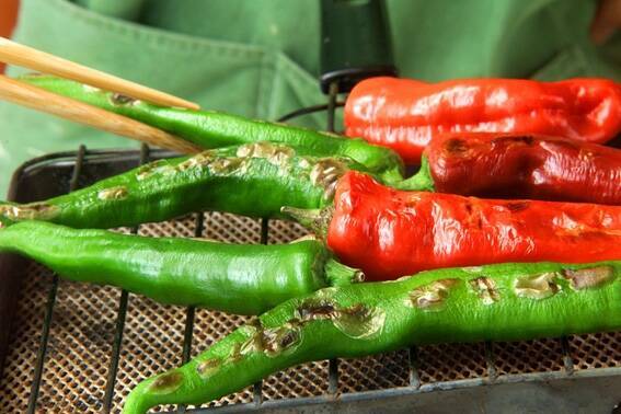 焼き網を強火にかけ、網が熱くなれば火を弱め、万願寺唐辛子を並べて全体に少し焼き色が付くまで焼く。