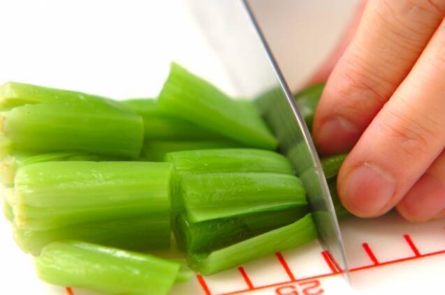 (1)の鍋に小松菜を根元から入れてゆでる。根元が柔らかくなったらザルにあけ、水で冷やす。しっかり絞って水気をきり、長さ3cmに切る。