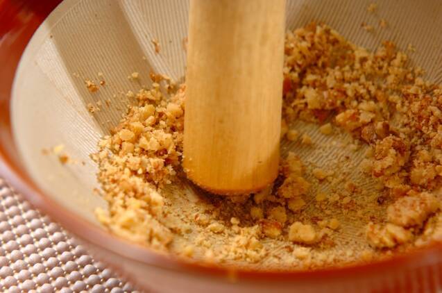 クルミはフライパンで乾煎りし、すり鉢に入れすりこ木で粗くする。