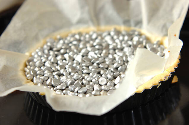 (6)が冷えて固くなったら、クッキングシートを敷いて重しをのせ、200℃に予熱しておいたオ―ブンで10分焼く。