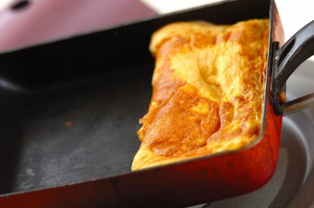 卵焼き器を中火で熱して薄く分量外のサラダ油をひき、卵液を全て入れる。表面が半熟状になったら半分に折り、両面焼いて半分に切る。